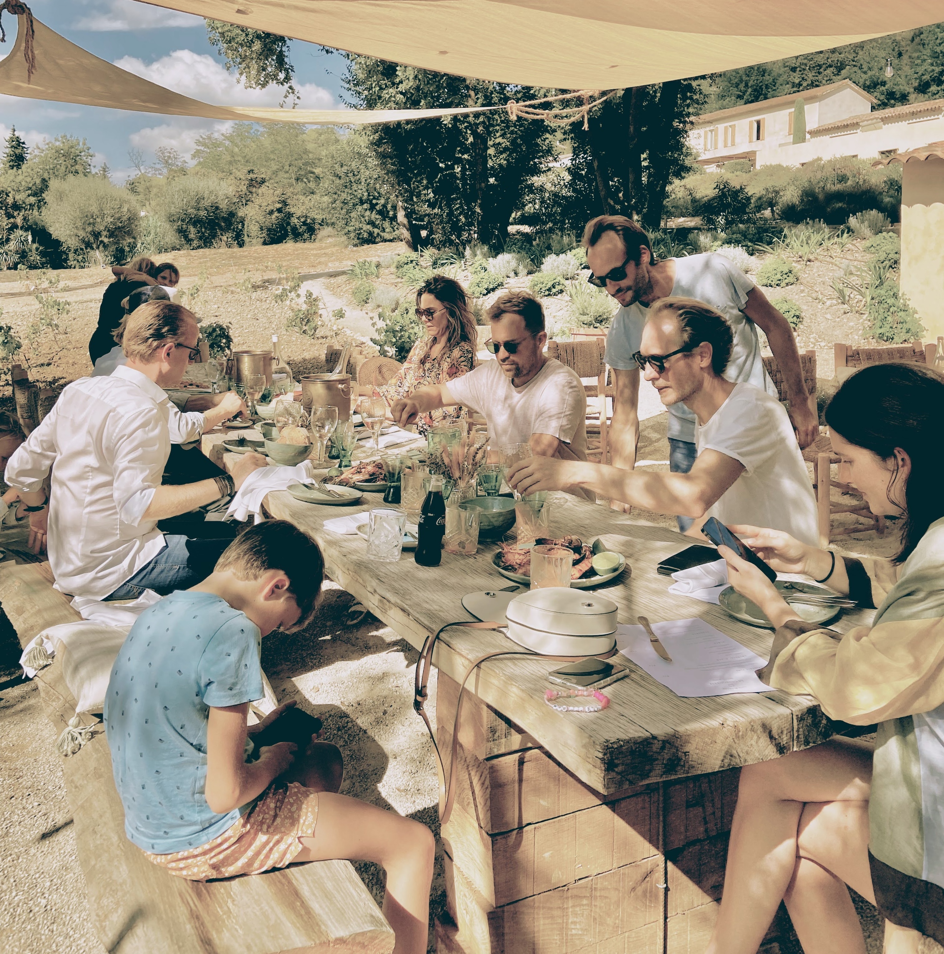 One evening, a longer table for dinner with the Leroy Brothers and other guests.