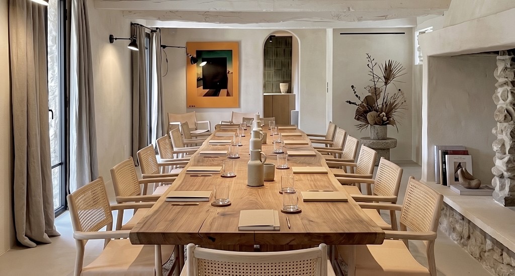 The working sessions take place in Mas de l’Artiste, the oldest building at Toile Blanche, configured around a long table in a two-hundred-year-old mas. The room has stone walls, original beams, and a work from the collection on the wall. The environment is not incidental to the thinking. It is part of it.